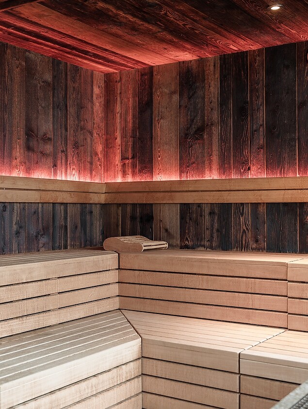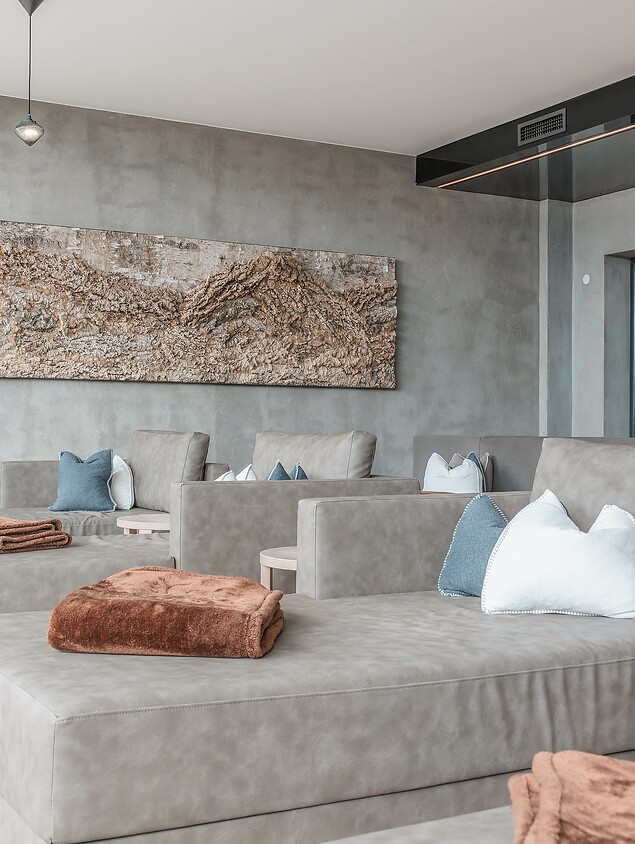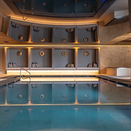 Wenn Sie sich lieber drinnen mit der Wärme des Wassers umgeben, erwartet Sie das Hallenbad mit einer Wassertemperatur von 32 °C. Nach ein paar Bahnen, begleitet vom Blick in den Garten und auf die Gipfel, laden die Relaxplätze am Beckenrand zum Ausruhen und Verweilen ein. Zwischendurch sorgt der Whirlpool für sprudelnde Abwechslung.
