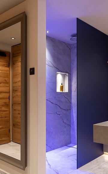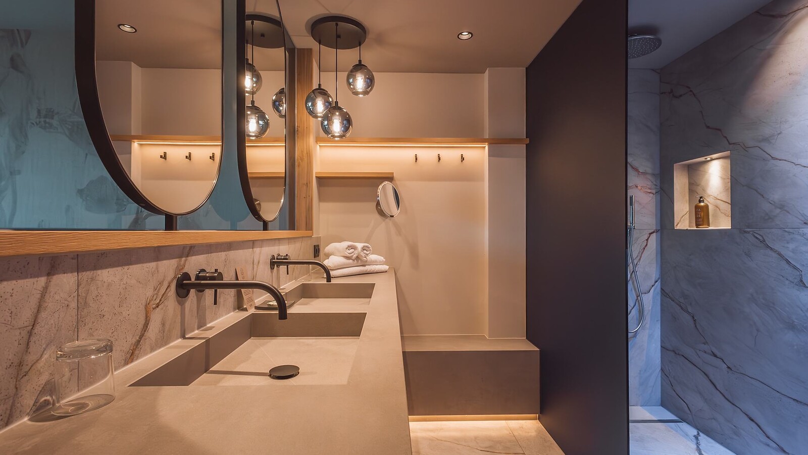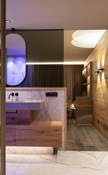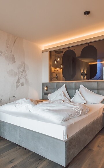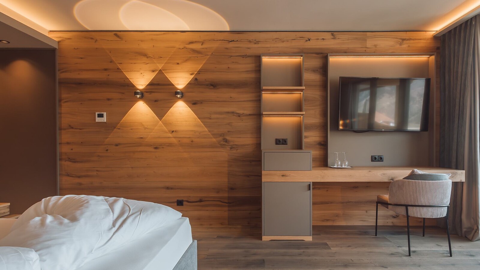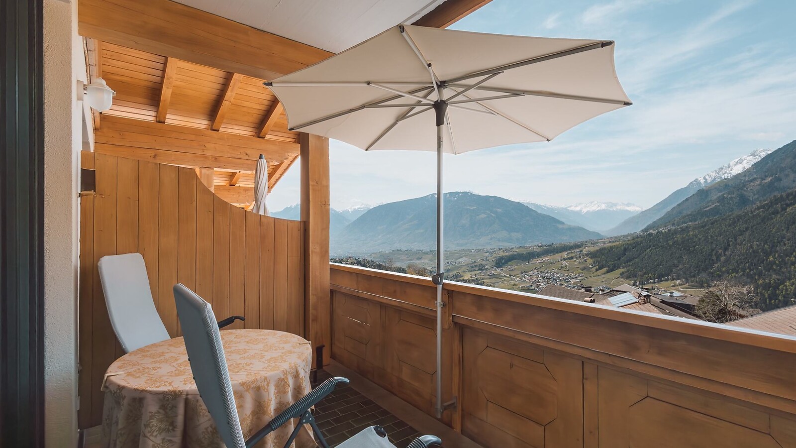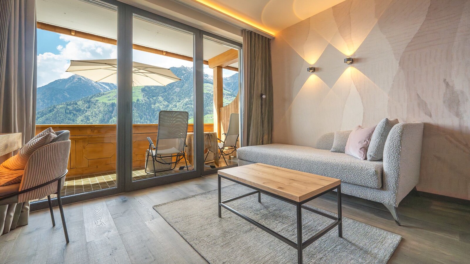 NEU 2024 - Großes Komfort-Doppelzimmer, Klimaanlage, Holzboden, Wohn- und Schlafraum, Badezimmer mit Doppelwaschbecken und großer Regendusche, separates WC, gemütliche Sitzecke, Schreibtisch, Kosmetikspiegel, Minibar, Sat-TV, W-Lan, Zimmersafe, Haarföhn, Südbalkon mit Panoramablick