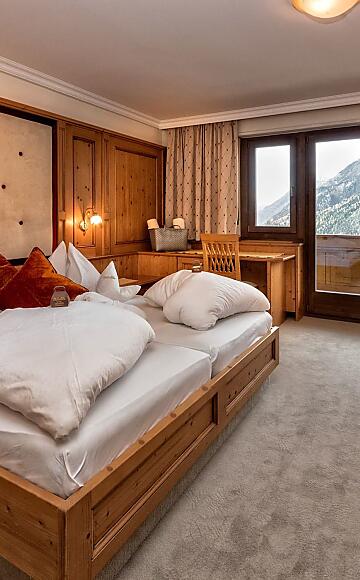 Komfort-Doppelzimmer mit Holzboden, Dusche, WC, Föhn, Kosmetikspiegel, Kühlschrank, Radio, Sat-TV, Telefon, W-Lan, Safe, Panoramabalkon, Südseite, teilweise mit Schräge.