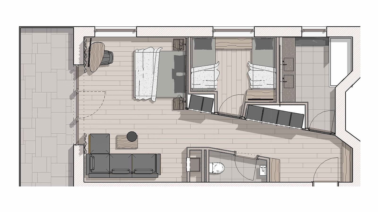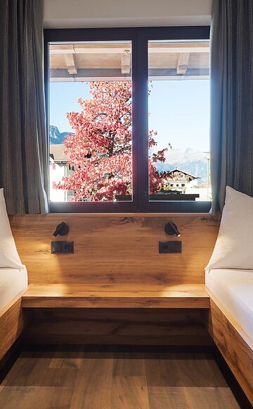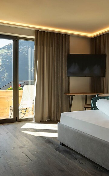 NEU 2024 - Komfort-Suite mit separatem Zimmer, Klimaanlage, Holzboden, Badezimmer mit Doppelwaschbecken und großer Regendusche, separates WC, gemütliche Sitzecke, Schreibtisch, Haarföhn, Kosmetikspiegel, Minibar, Sat-TV, W-Lan, Zimmersafe, Südbalkon mit Panoramablick