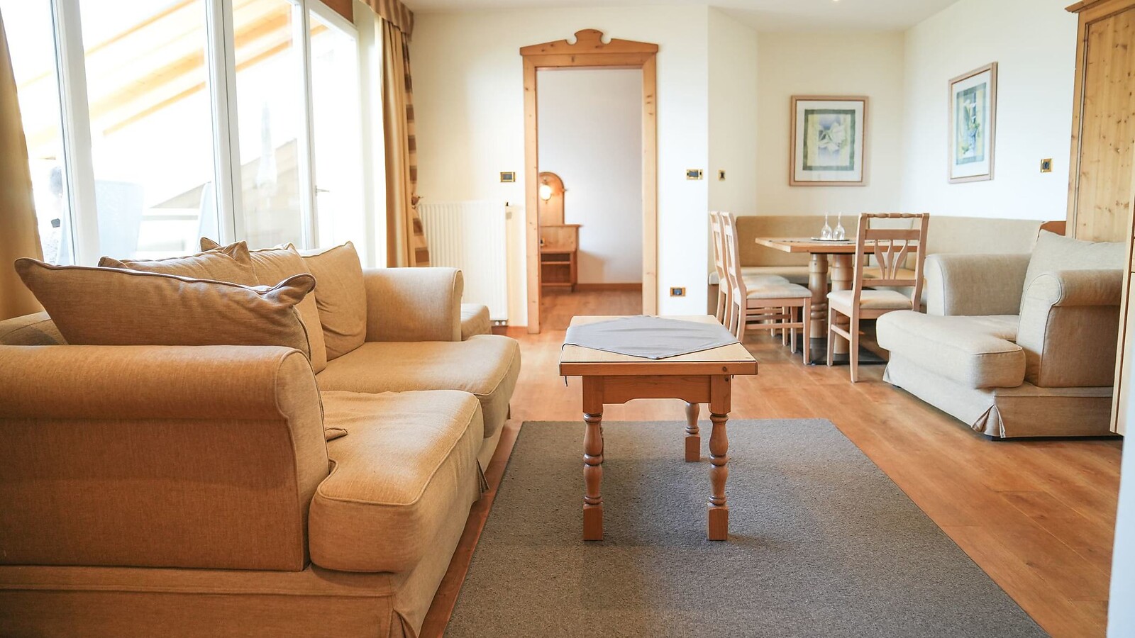 2 Komfort-Doppelzimmer, Wohnraum, neu renoviertes Badezimmer, Dusche, WC, Waschbecken, Föhn, Kosmetikspiegel, Kühlschrank, Radio, Telefon, Sat-TV, W-Lan, Safe, Panoramabalkon, Südseite