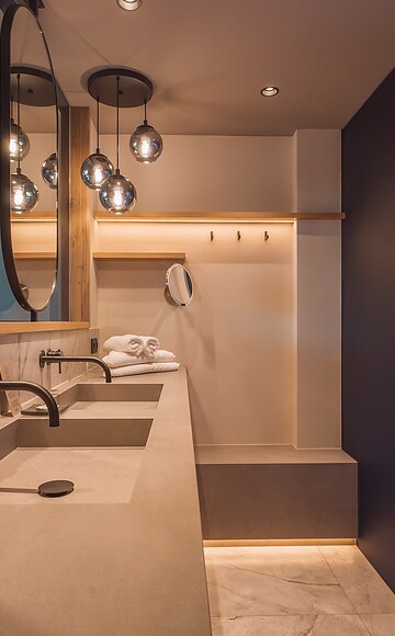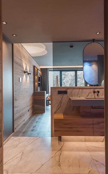 NEU 2024 - Großes Komfort-Doppelzimmer, Klimaanlage, Holzboden, Wohn- und Schlafraum, Badezimmer mit Doppelwaschbecken und großer Regendusche, separates WC, gemütliche Sitzecke, Schreibtisch, Kosmetikspiegel, Minibar, Sat-TV, W-Lan, Zimmersafe, Haarföhn, Südbalkon mit Panoramablick