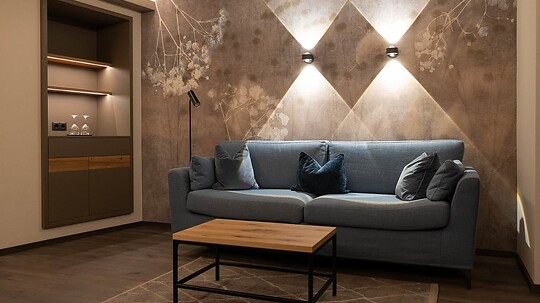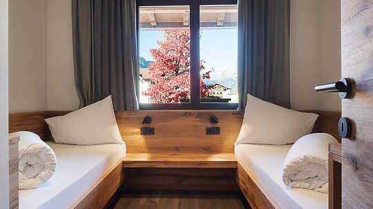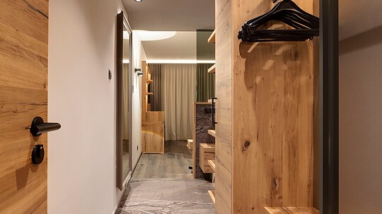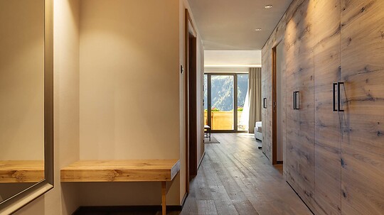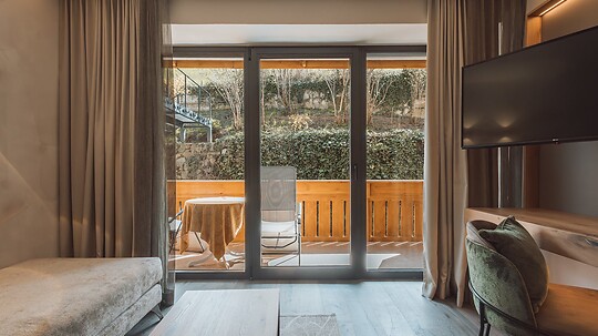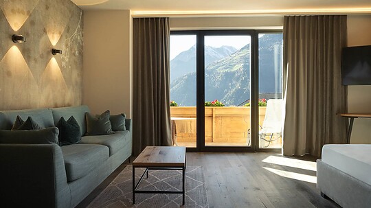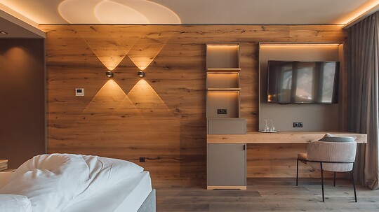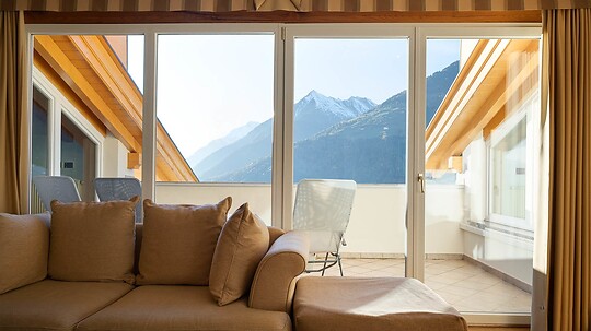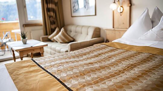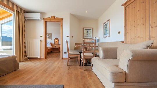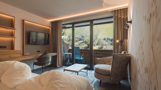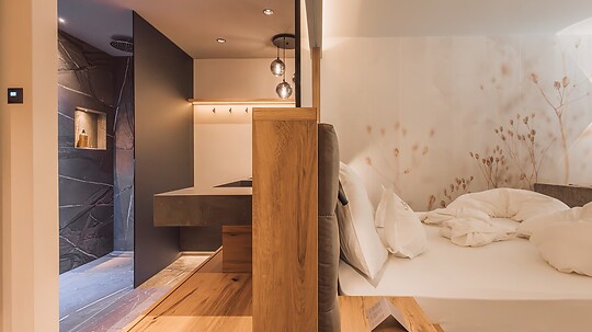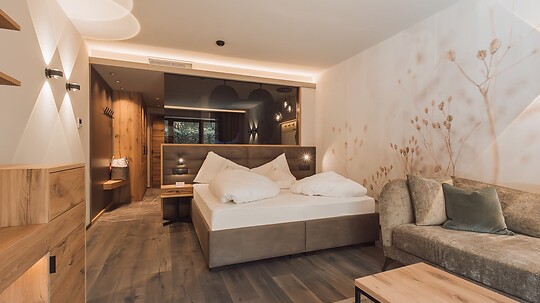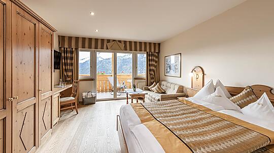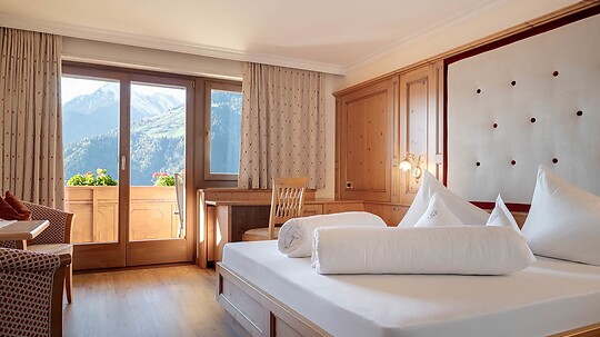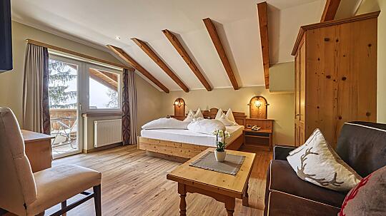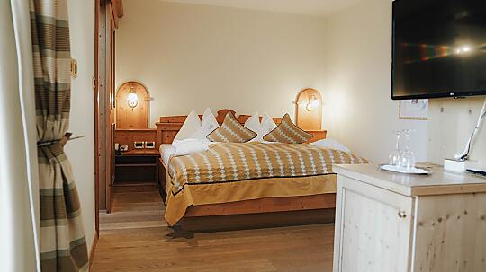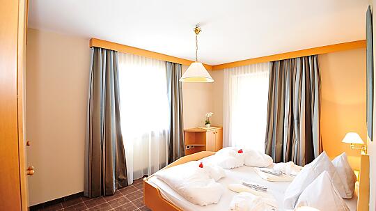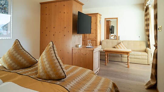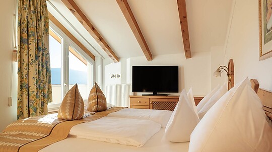 Comfortable double room with wooden floor, shower, WC, hairdryer, make-up mirror, fridge, radio, satellite TV, W-Lan, telephone, safe, panoramic balcony, south-facing