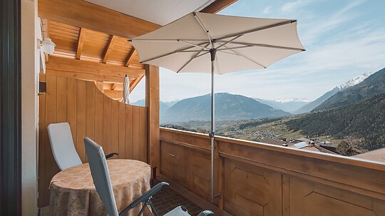Comfortable double room with wooden floor, shower, WC, hairdryer, make-up mirror, fridge, radio, satellite TV, telephone, W-Lan, safe, panoramic balcony, south-facing,...