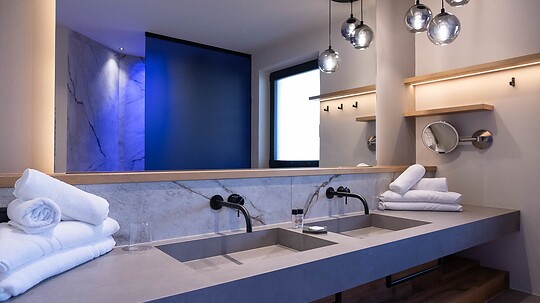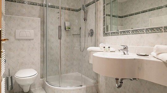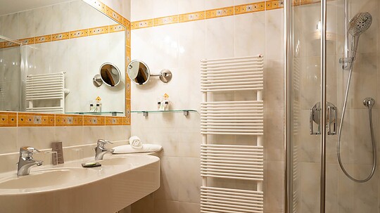 Comfortable double room with double washbasin, shower, WC, hairdryer, make-up mirror, fridge, radio, flatscreen satellite TV, W-Lan, telephone, safe, north-facing...