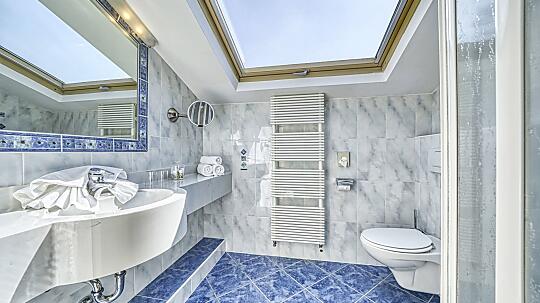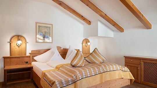 Attic double room with shower, WC, hairdryer, make-up mirror, fridge, radio, flatscreen, satellite TV, W-Lan, telephone, safe, without balcony.