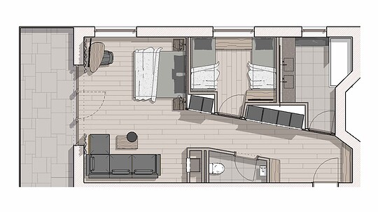 NEW 2024 - Comfort suite with separate room, air conditioning, wooden floor, bathroom with double washbasin and large rain shower, separate WC, cosy sitting area, desk,...