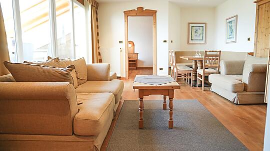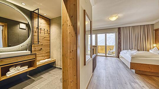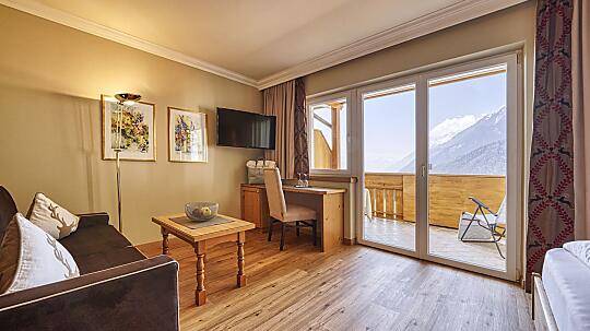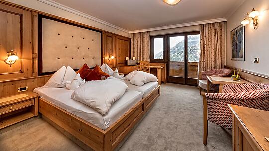 Comfortable double room with wooden floor, shower, WC, hairdryer, make-up mirror, fridge, radio, satellite TV, W-Lan, telephone, safe, panoramic balcony, south-facing