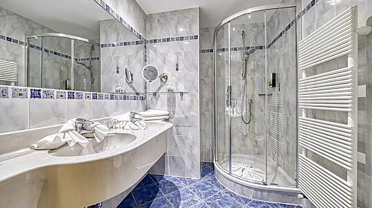 Comfortable double room with double washbasin, shower, WC, hairdryer, make-up mirror, fridge, radio, flatscreen satellite TV, W-Lan, telephone, safe, north-facing...
